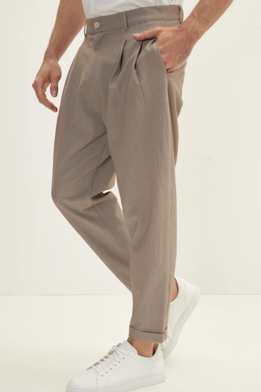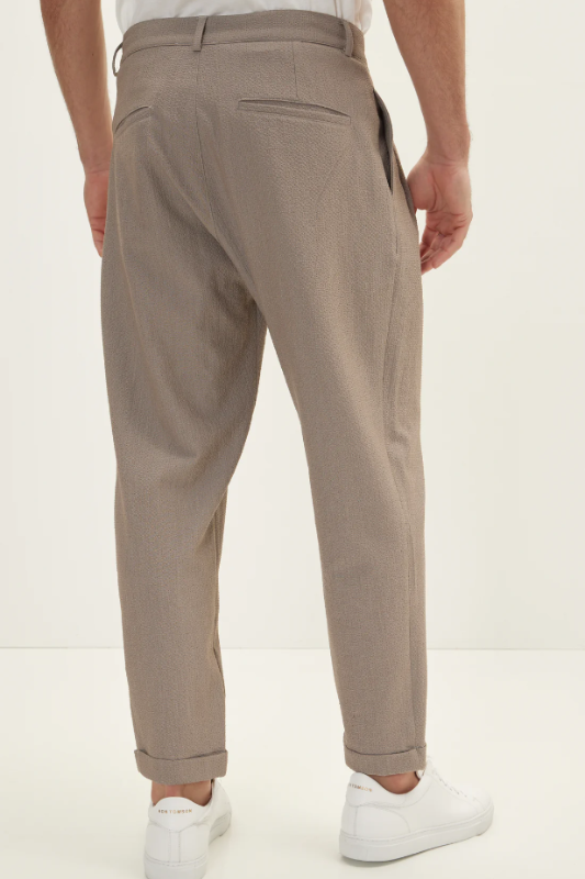 Brown textured dress pant featuring front pleats, side pockets, belt loops and cuffed hem
