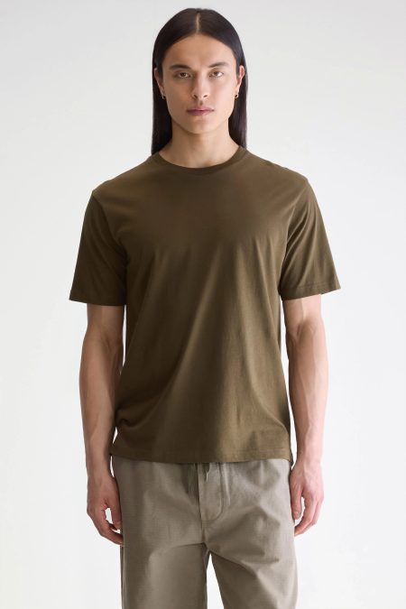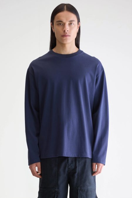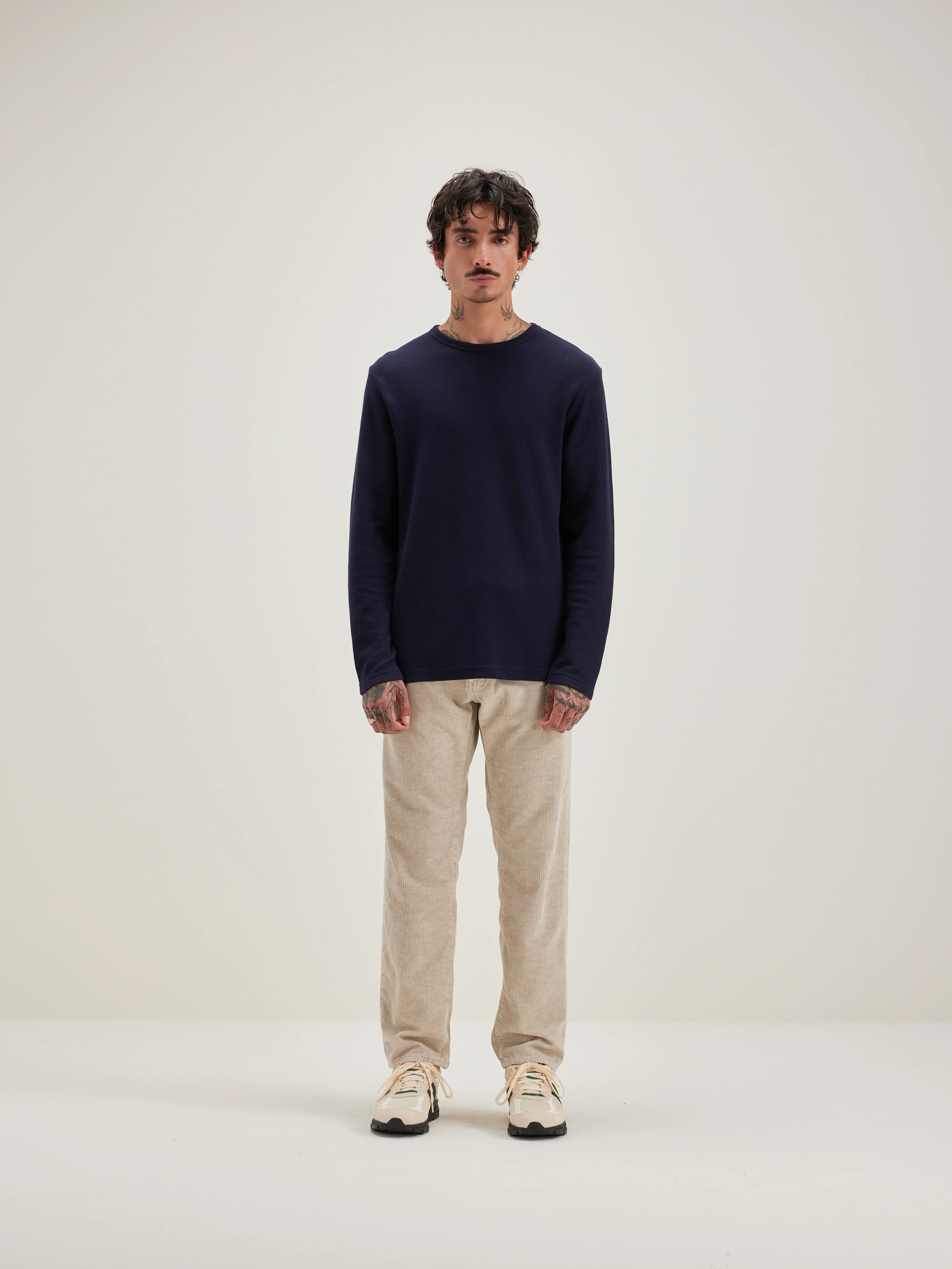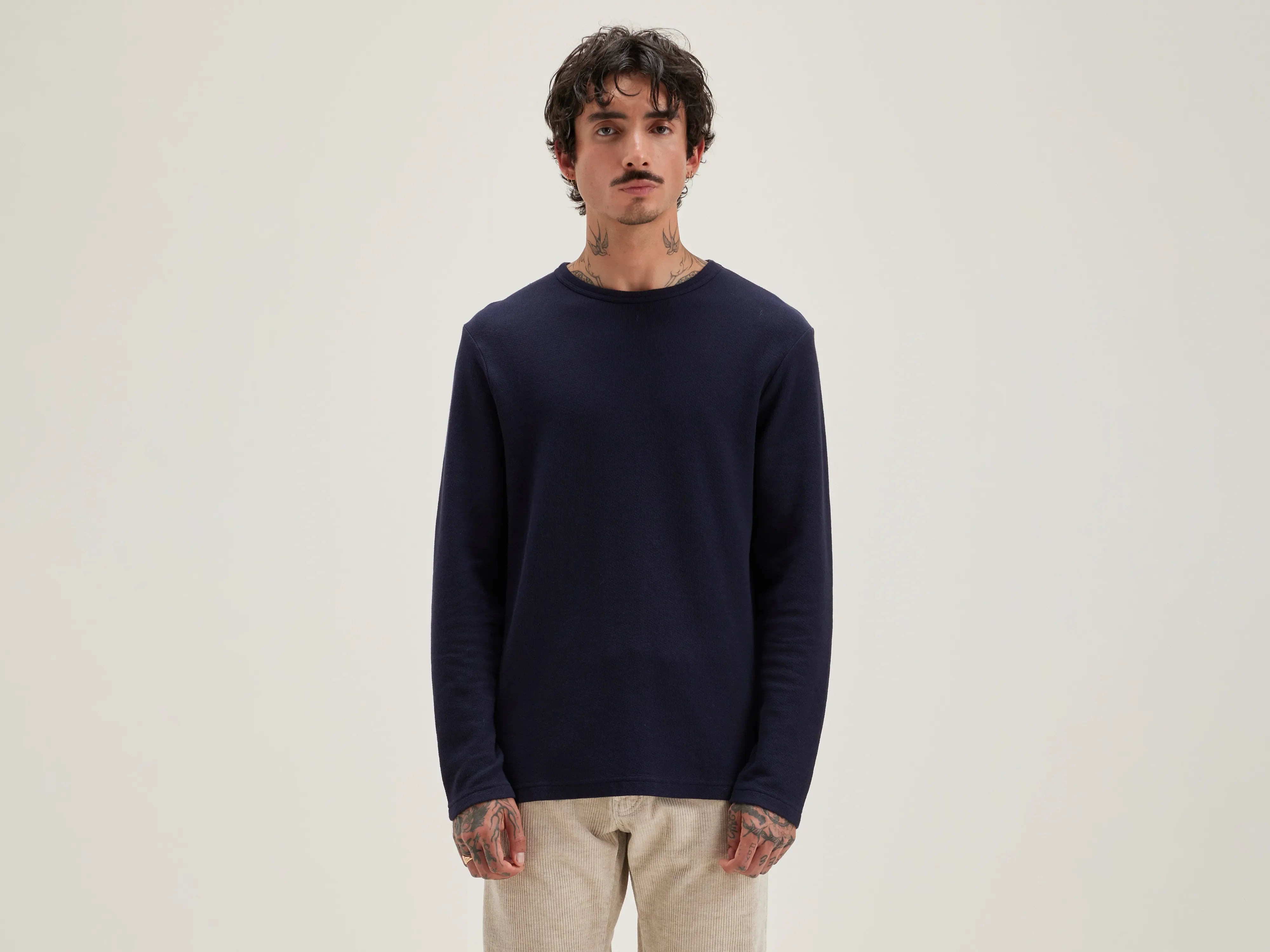 Regular, long sleeve, crew-neck t-shirt in navy blue double face cotton jersey.